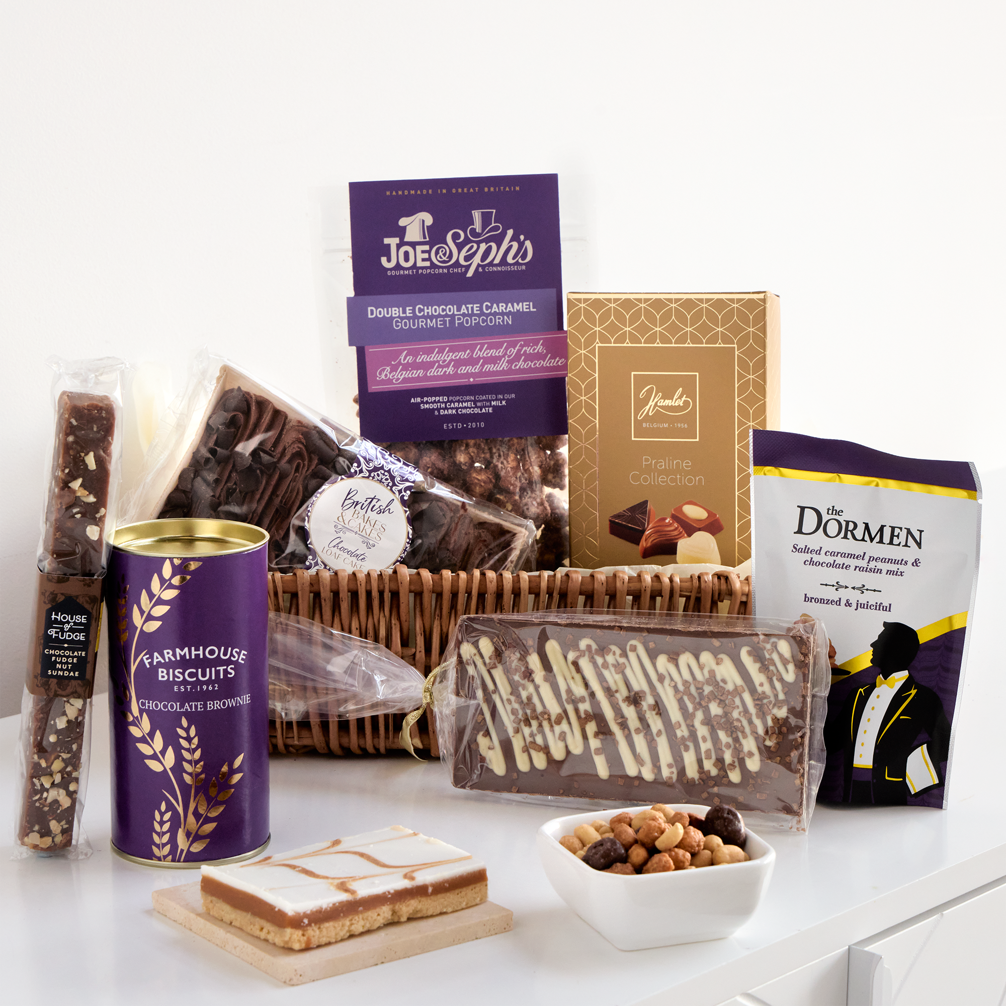 A chocoholic's dream, this basket is bursting with gourmet cocoa-y goodness. From a fudge nut sundae fudge log, to a praline collection, to chocolate caramel popcorn – this is one to satisfy their sweet tooth.