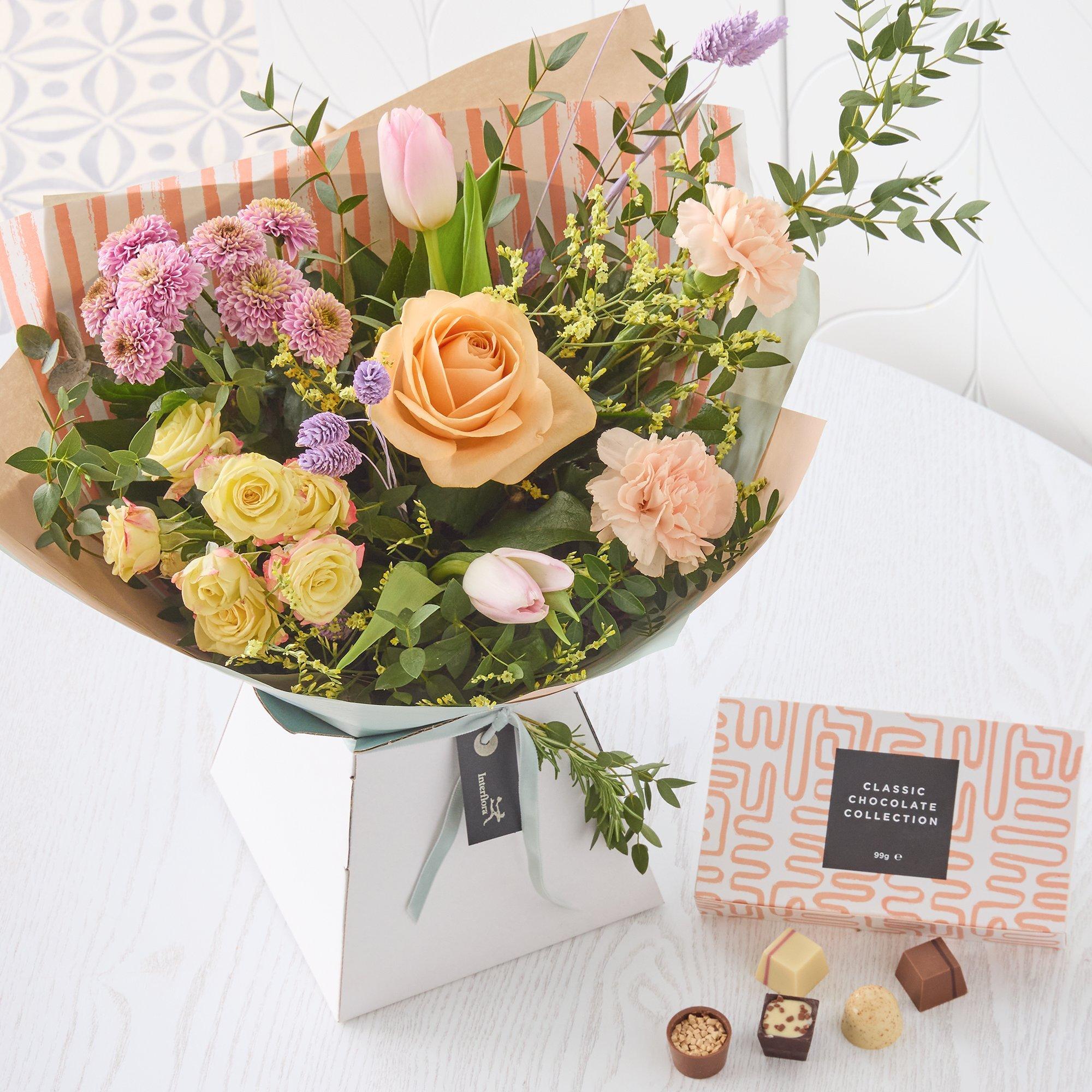 A quick rundown: a handmade bouquet of fresh flowers in soft pastel shades, plus a selection of scrumptious chocolates.
