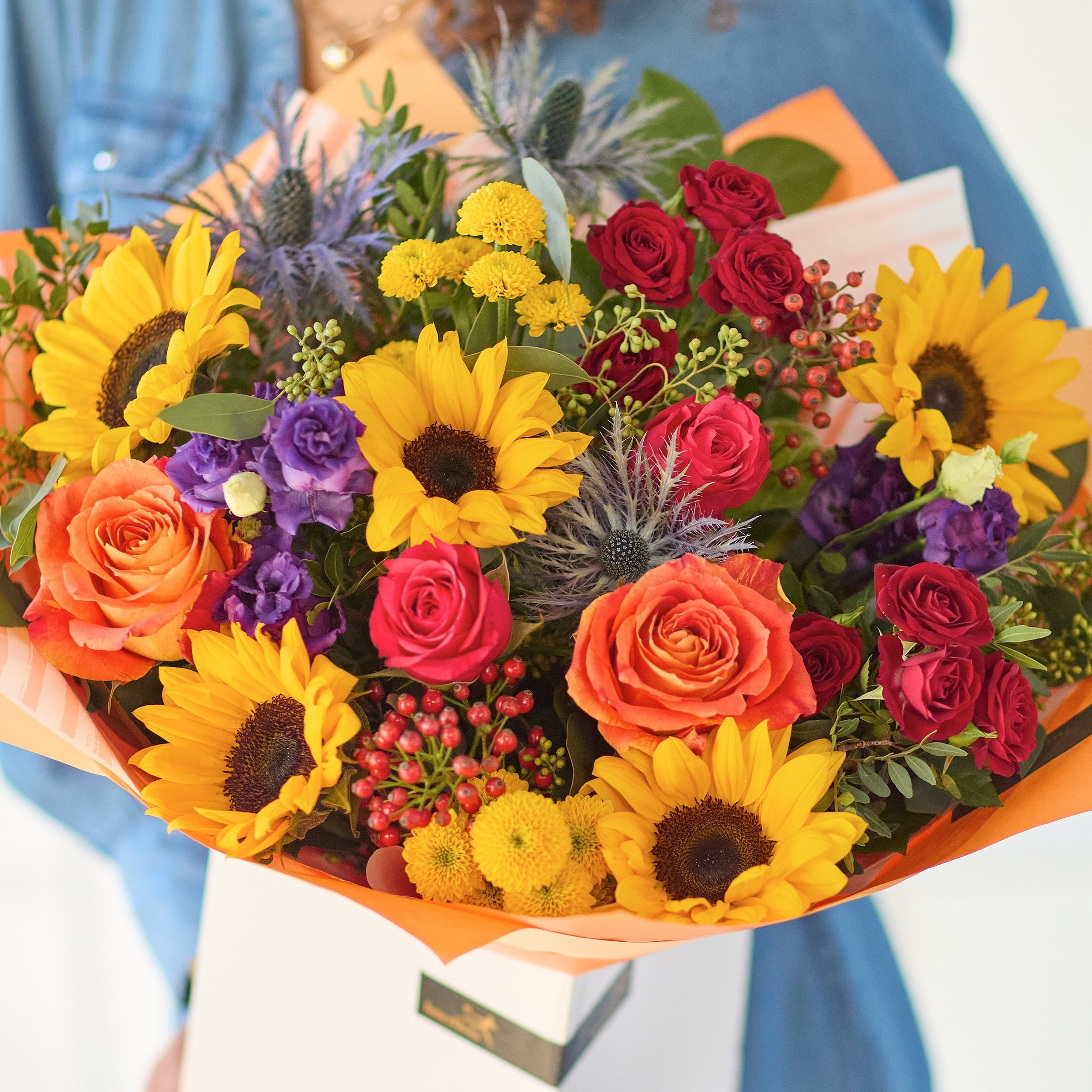 Our grandest autumn bouquet this one is a riot of colour and joy. It's all about celebrating the rich jewel tones we find this time of year, plus capturing the last of the sunshine. It'll feature flowers in vivid shades like ruby, amber, mustard and plum, plus at least five joyous sunflowers.